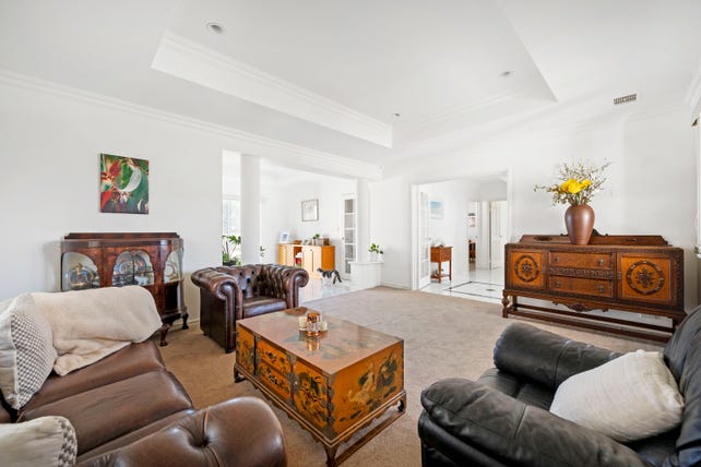 Extras include direct backyard access from the family room, built-in wardrobes, a hidden laundry chute, ducted reverse-cycle air-conditioning with smart controls, gas bayonets for heating, integrated ceiling audio speakers, electric security roller shutters, an electric outdoor blind, a bore on the property, established lawns and gardens and a separate front boat, caravan or trailer parking bay, to the side.