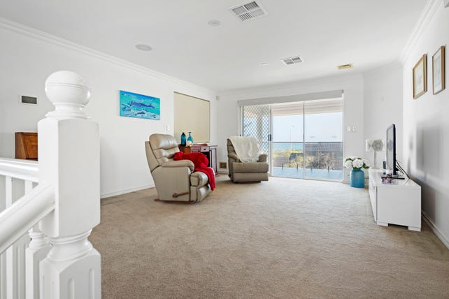 Upstairs, a generous covered alfresco-style balcony encourages all-seasons’ entertaining with the best vantage point of all – capturing breathtaking ocean views and magical evening sunsets in the distance. It can be accessed from the expansive and carpeted retreat-cum-third living area. The master suite is the obvious pick of the bedrooms with a bathroom nearby, whilst the carpeted study up here even has a custom wooden Jarrah desk, in the corner of the room.