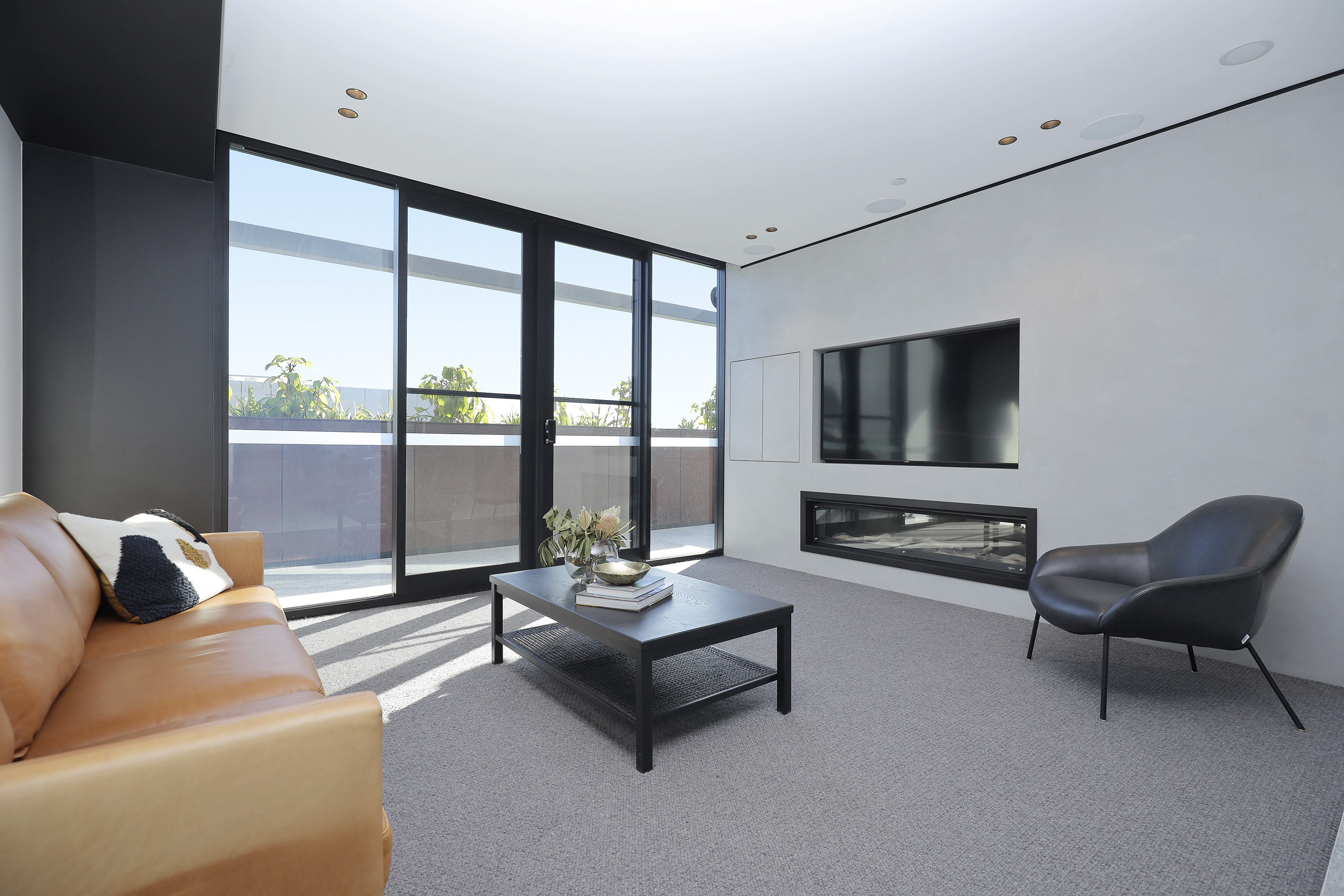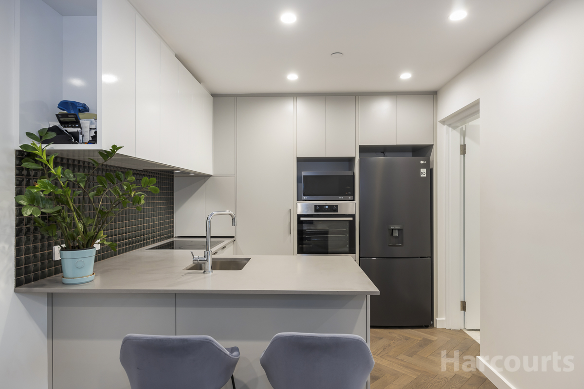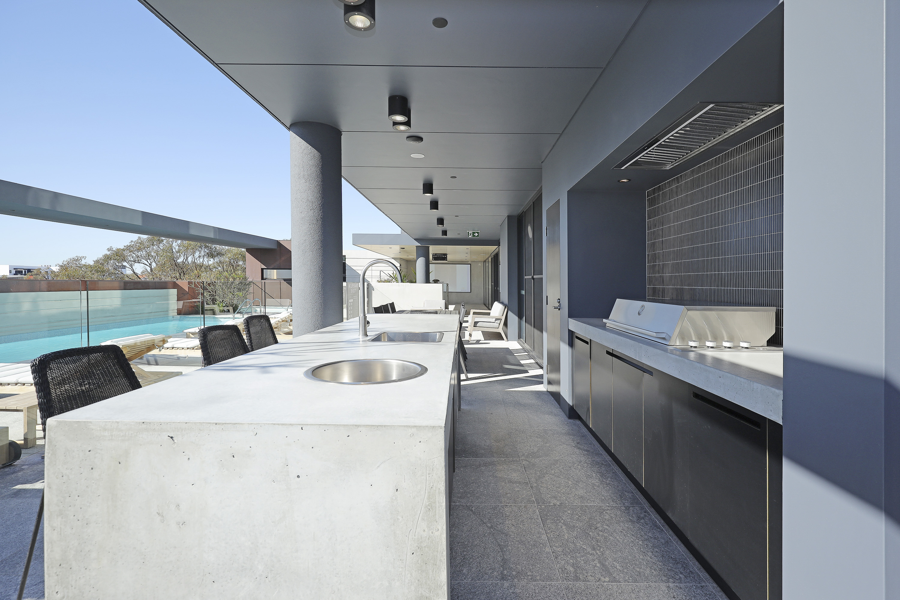 An open plan living and dining area bathed in natural light with high ceilings and views of the ocean. A sleek kitchen comprising of AEG hob top, oven and dishwasher, reconstituted stone bench top and breakfast bar with plenty of storage.