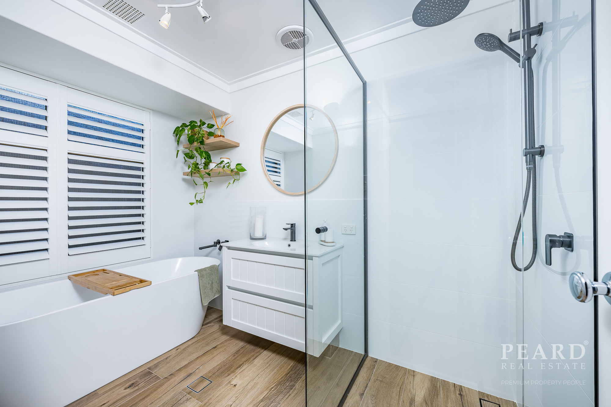 - Renovated main bathroom with wood-look tiling, freestanding bathtub, corner shower, accented gunmetal hardware, modern vanity with stone benchtops and a separate powder room.