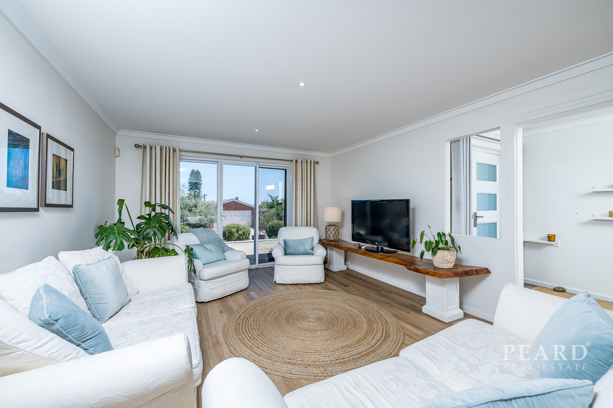 Flowing into the secondary living room, a light-filled and comfortable space awaits. Sliding doors from both the dining and living areas open to the backyard, offering a seamless blend of indoor-outdoor living, entertaining and alfresco dining.