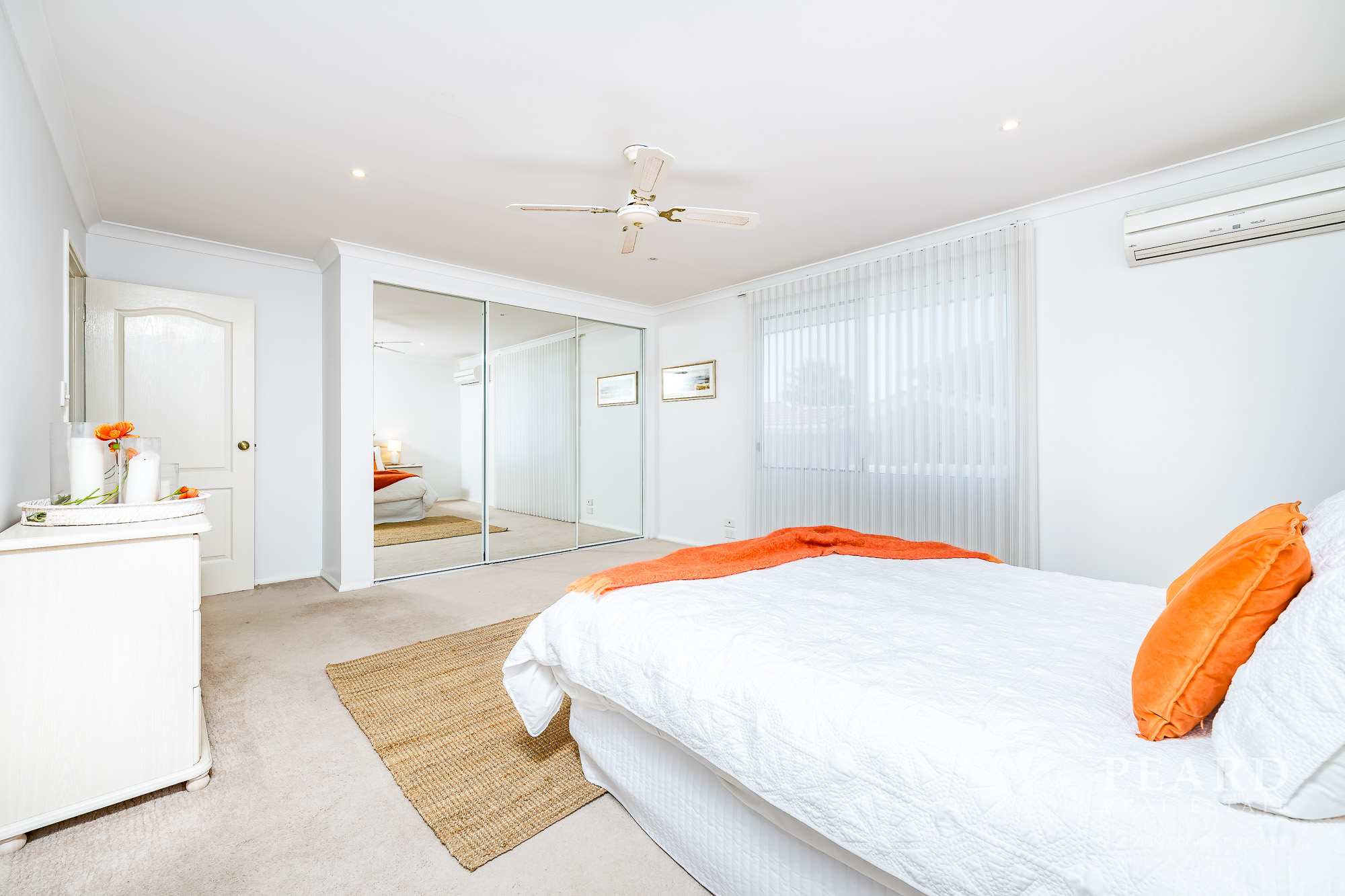 - Well-sized bedroom with carpet flooring, ceiling fan and double mirrored sliding robes.