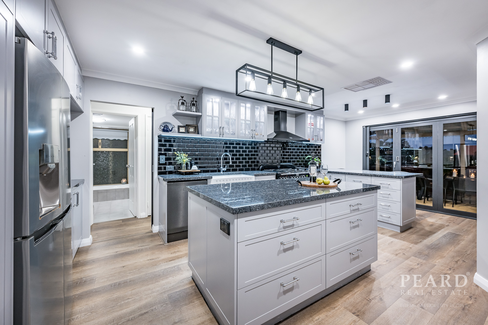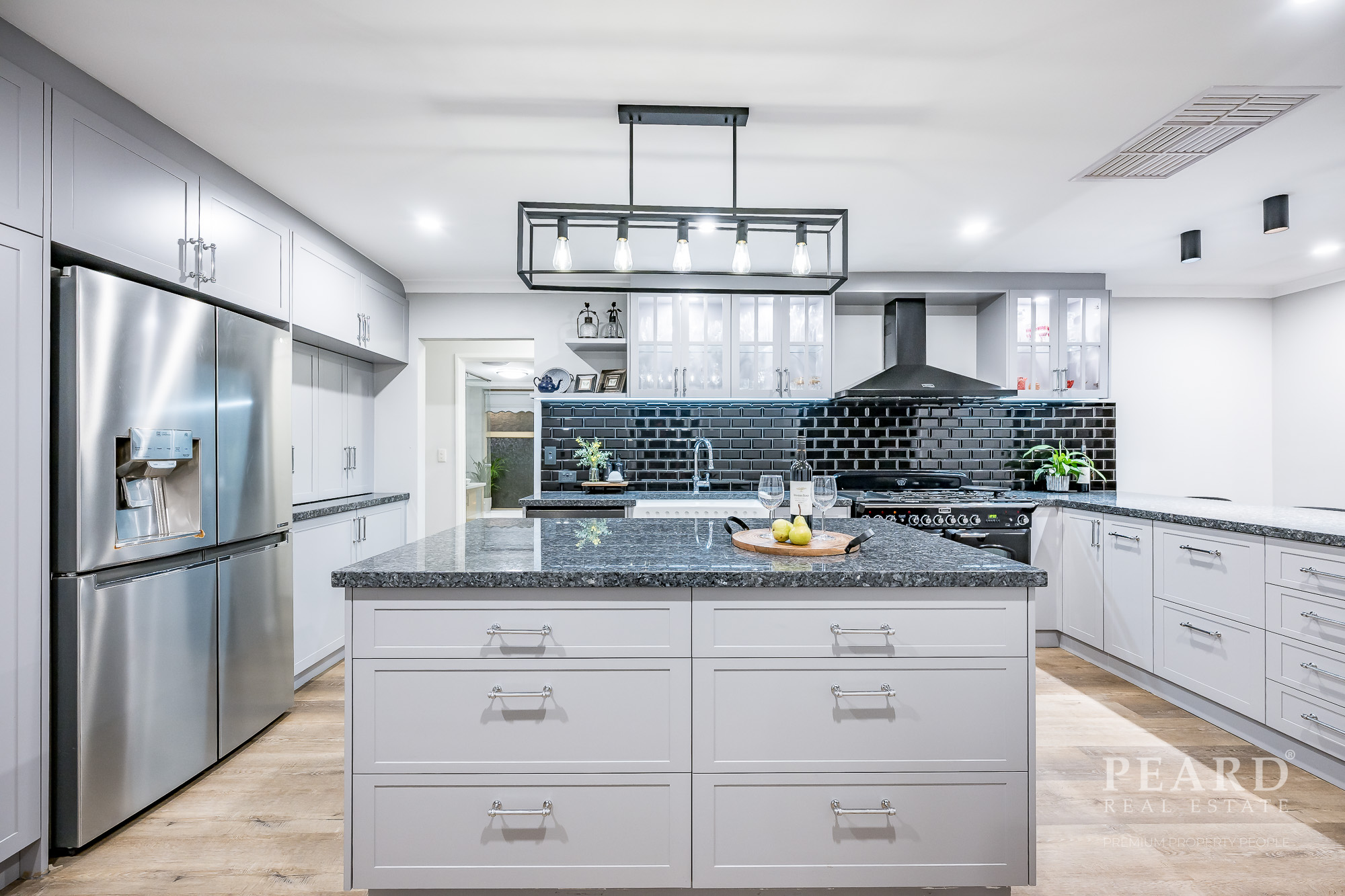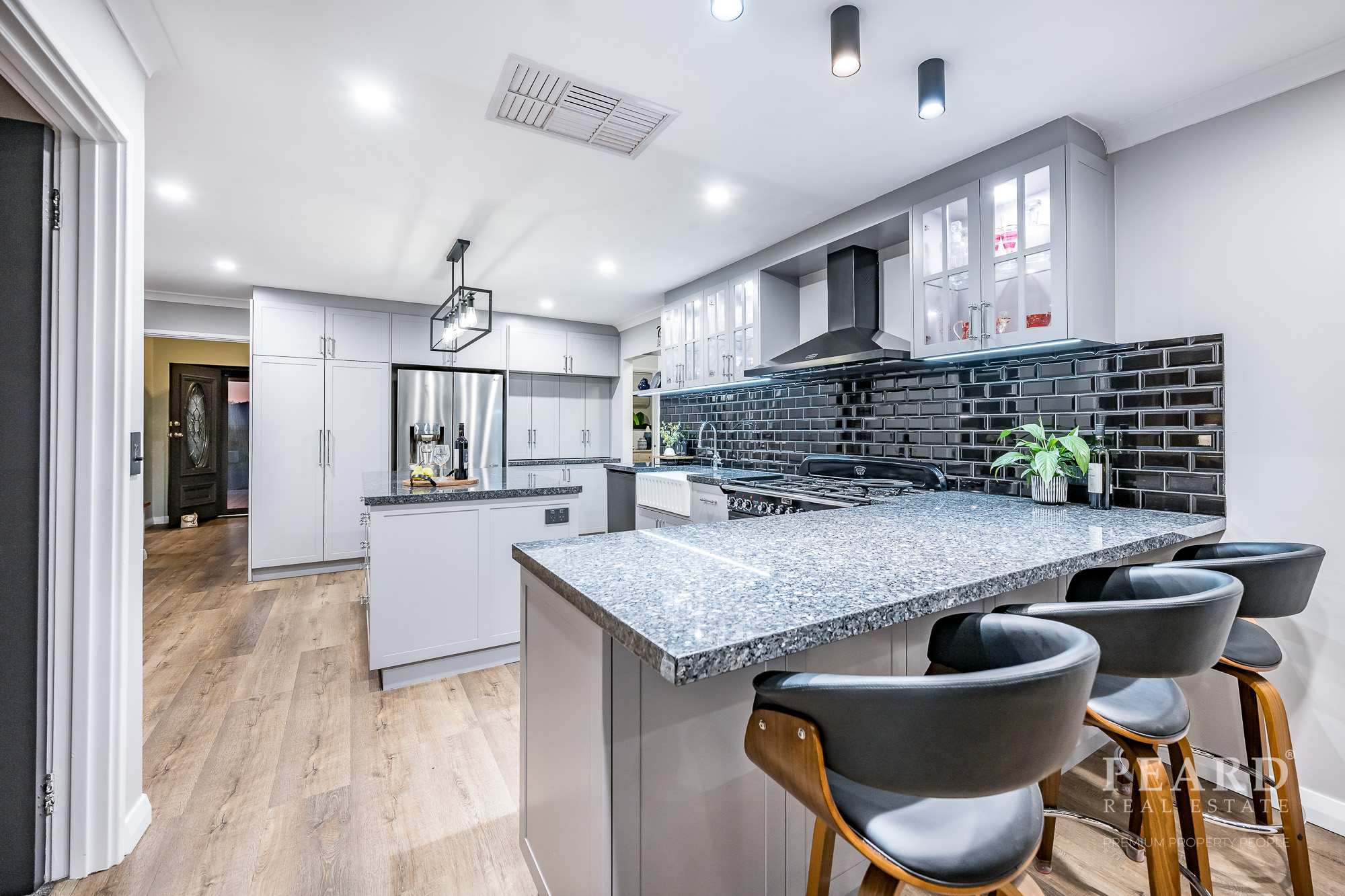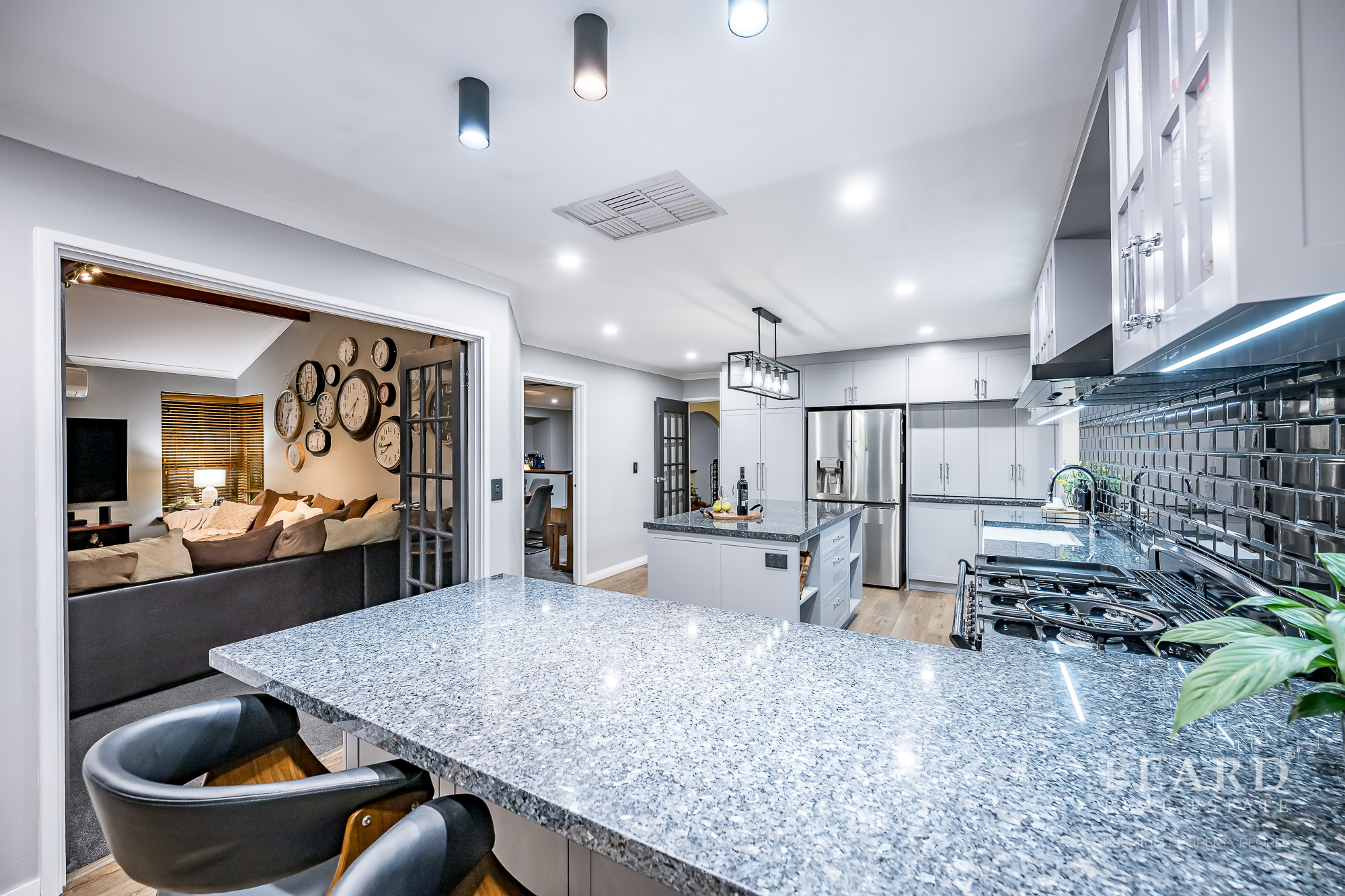 On the other side of a gorgeous French door, a huge open-plan kitchen has been impeccably renovated to include sparkling Blue Pearl granite bench tops, ample storage options (including a double pull-out pantry), double farmhouse sinks, a breakfast bar, an appliance nook, an Asko dishwasher, a Falcon range hood and an amazing 1100mm-wide Falcon Classic Induction-plate, double-oven, grill and bread-warmer setup.