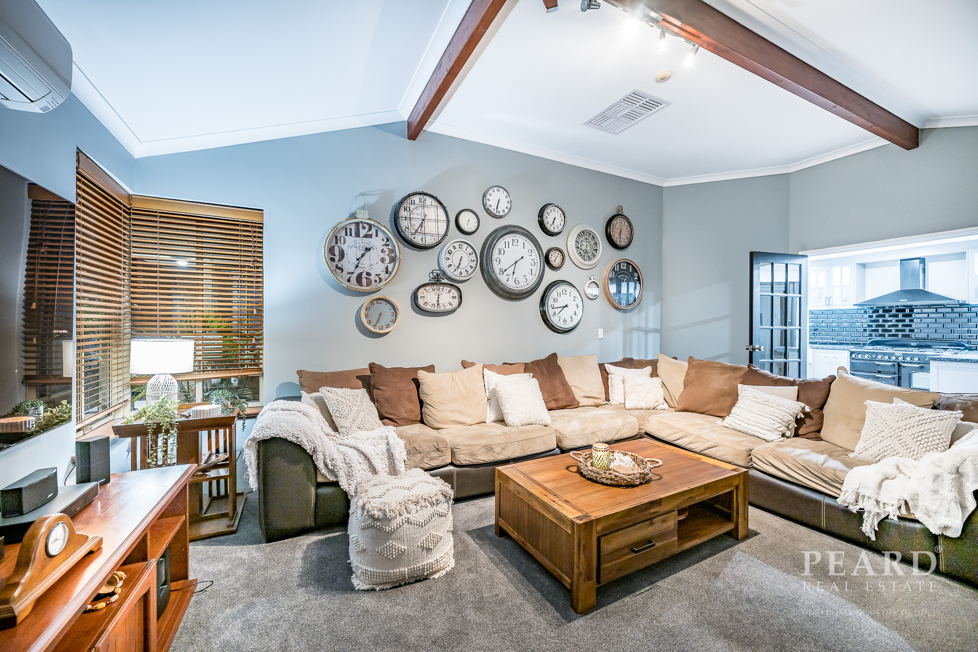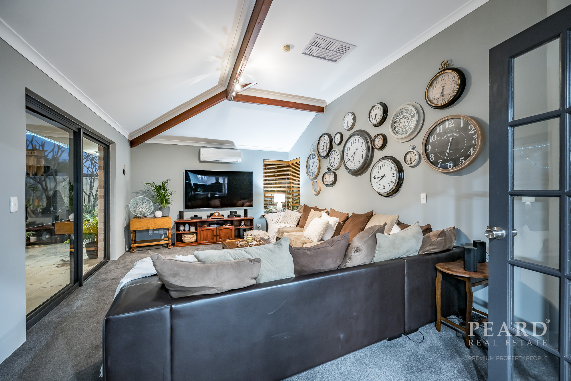 The spacious carpeted family room next to the kitchen is where most of your casual time will be spent and sits behind double French privacy doors of its own that reveal high ceilings, split-system air-conditioning and a corner wood-burner fireplace heater.