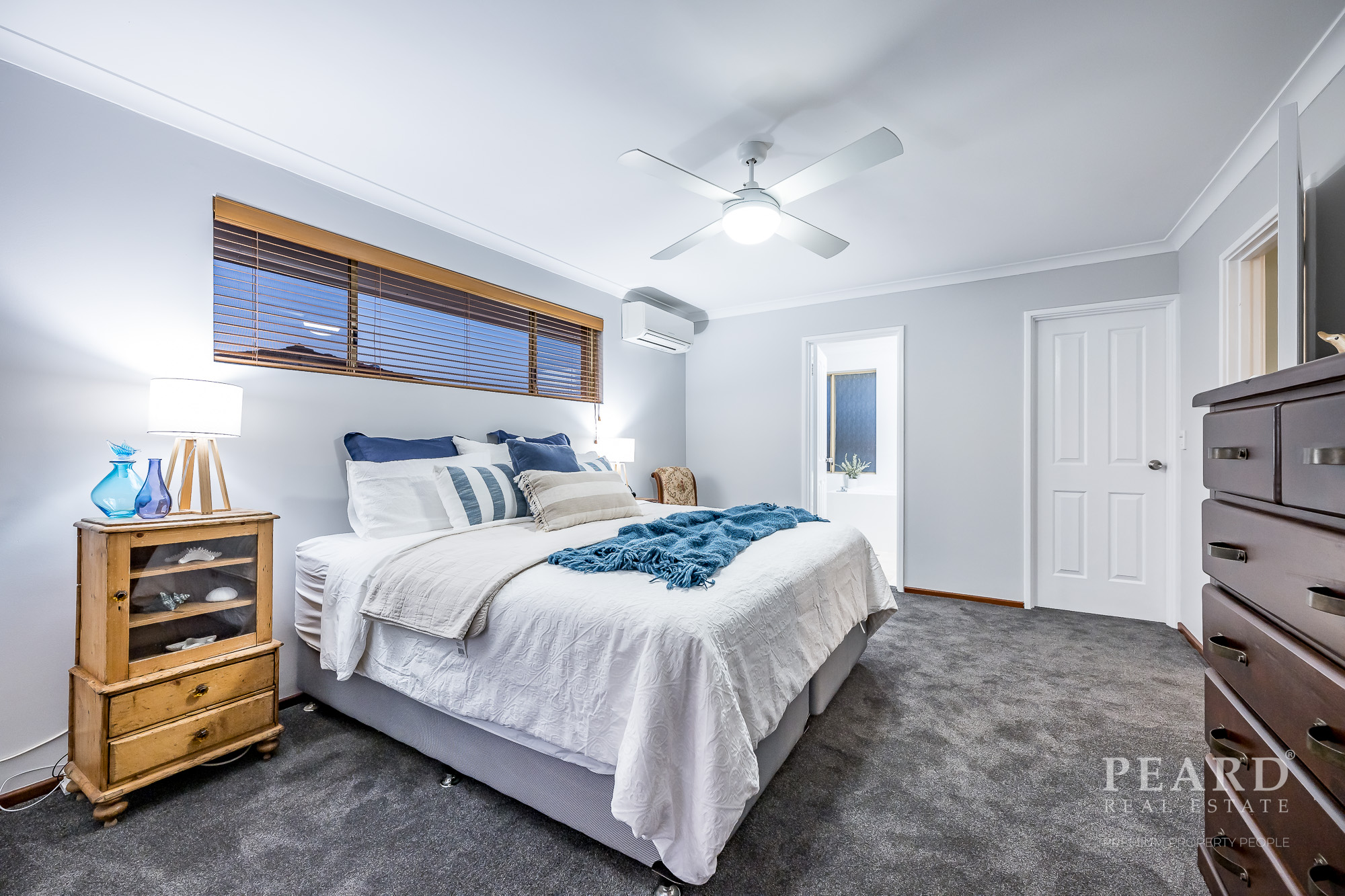 The huge master suite only inches away is also carpeted and boasts split-system air-conditioning, a walk-in robe (with a floor safe), balcony access, a stunning sea vista from bed and a brand-new fully-tiled and revamped ensuite – rain shower, bubbling spa bath, toilet, twin “his and hers” vanities and all.