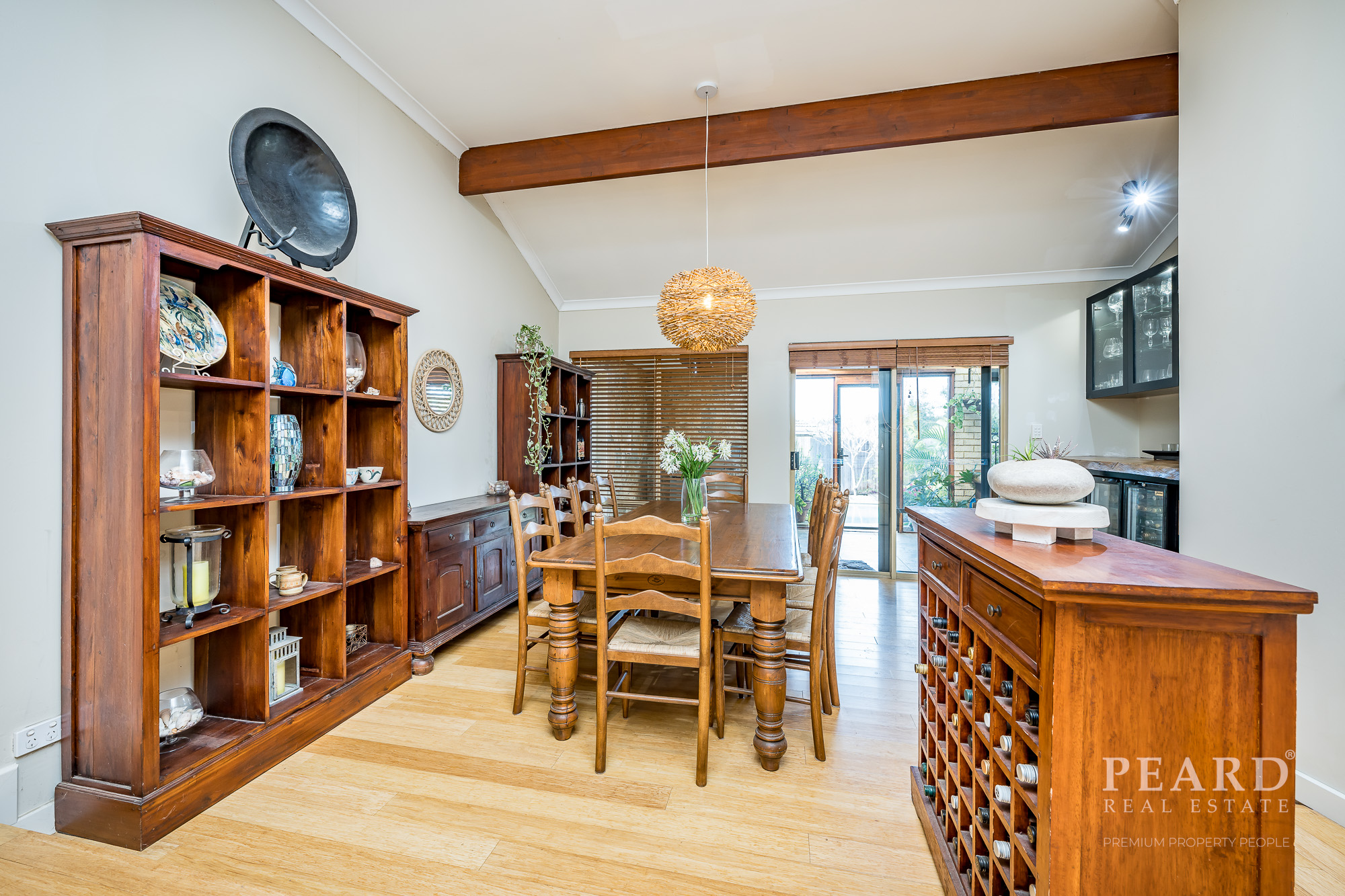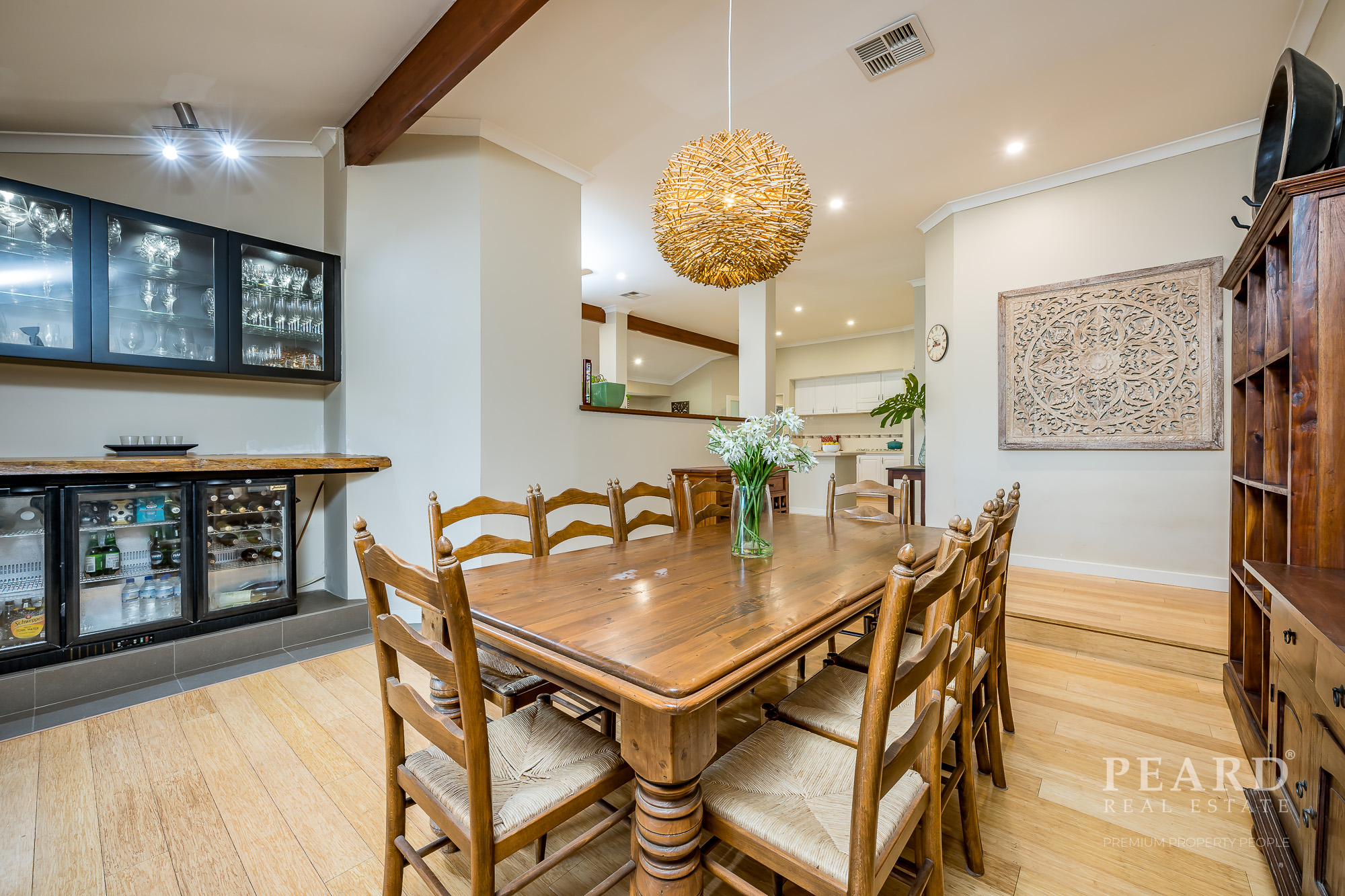 The formal dining room welcomes you into the open-plan heart of the home. With its sunken design and ramped access, the space feels airy and warm, featuring 3.1 metre high ceilings, a striking wood beam, and a custom bar with a marri wood benchtop, LED lighting, bar fridges, and overhead storage, ensuring every meal is a special occasion.