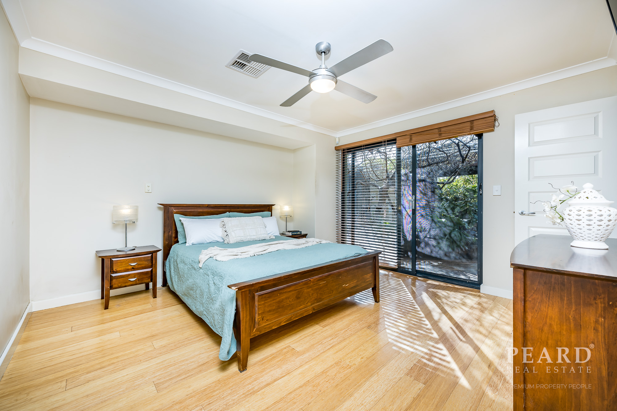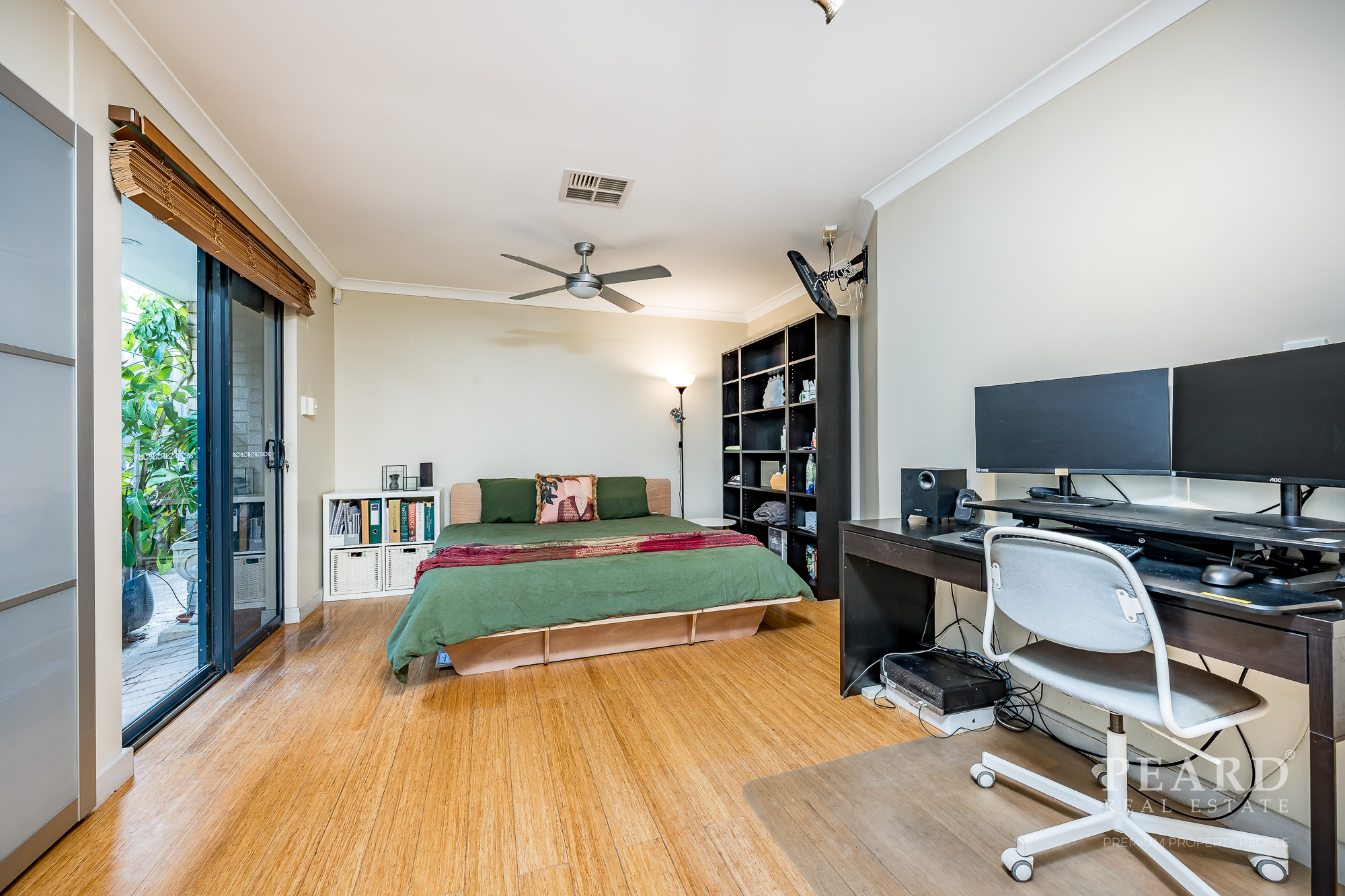 The second bedroom features a ceiling fan, sliding built-in robe, and a private ensuite with stone benchtops and a frameless glass shower, all designed for wheelchair access. This spacious room is perfect for older teens seeking their own space, complete with separate sliding door access through the front courtyard.