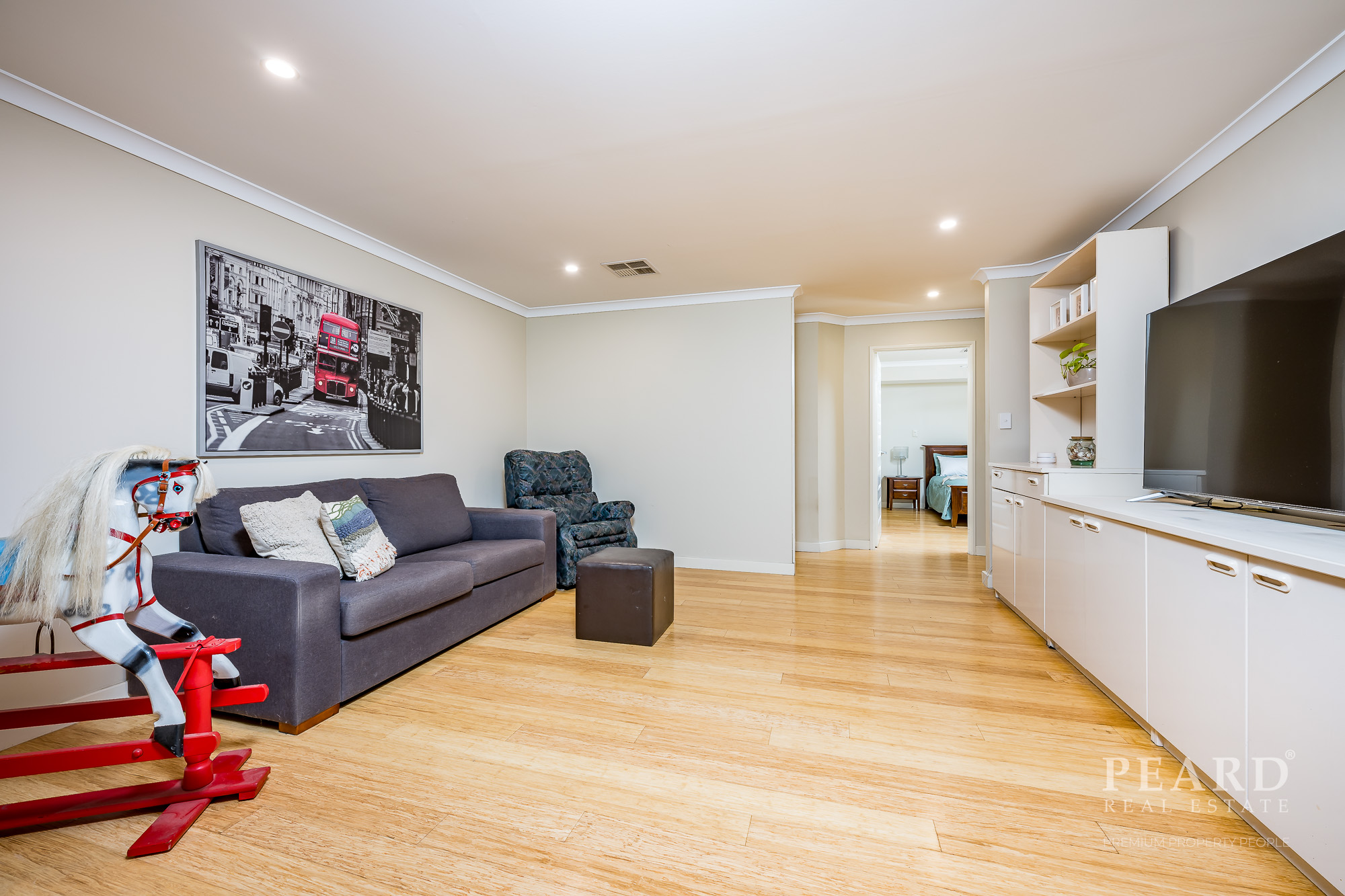 Through the front portico and entryway, the formal living area greets you with bamboo flooring and ambient downlighting throughout, with a built-in TV wall cabinet ensuring a sleek and organised space. A pocket door separates the space from the rest of the home, offering a private lounge perfect for relaxing.