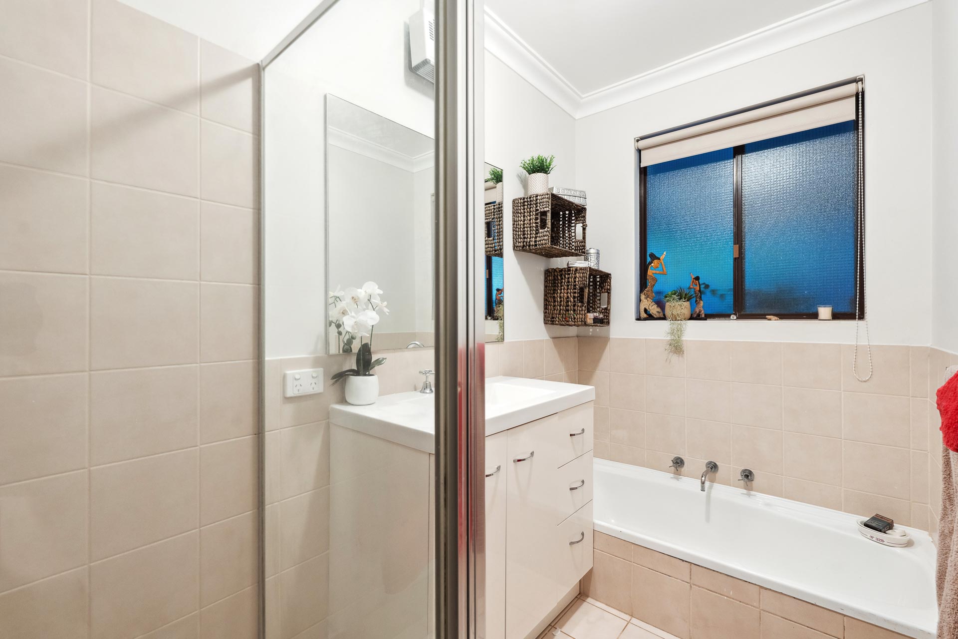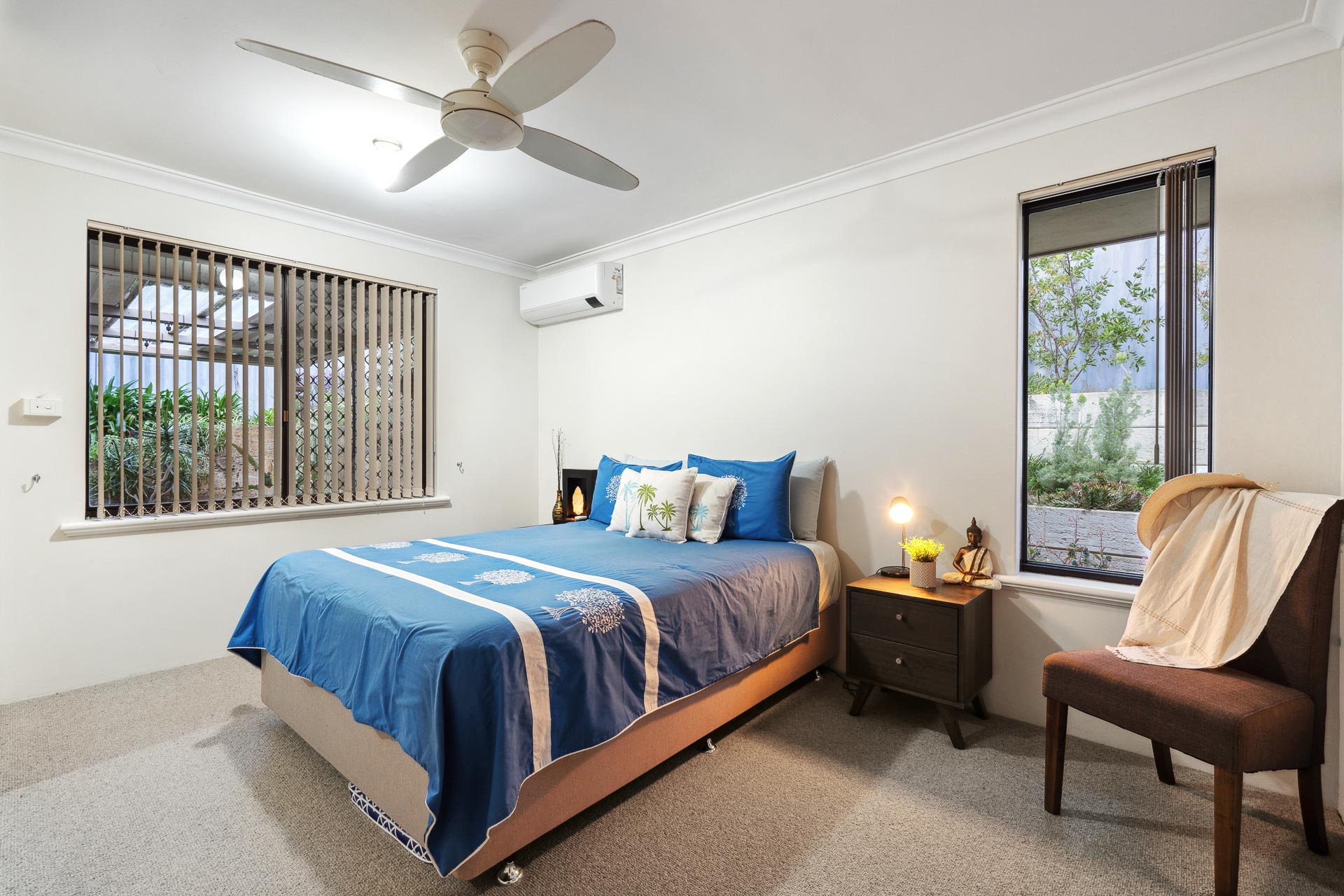 Both queen-sized bedrooms are carpeted with built-in robes, and the modern bathroom includes a separate bath, shower, and vanity. The adjacent laundry offers practicality with direct access to the rear courtyard.