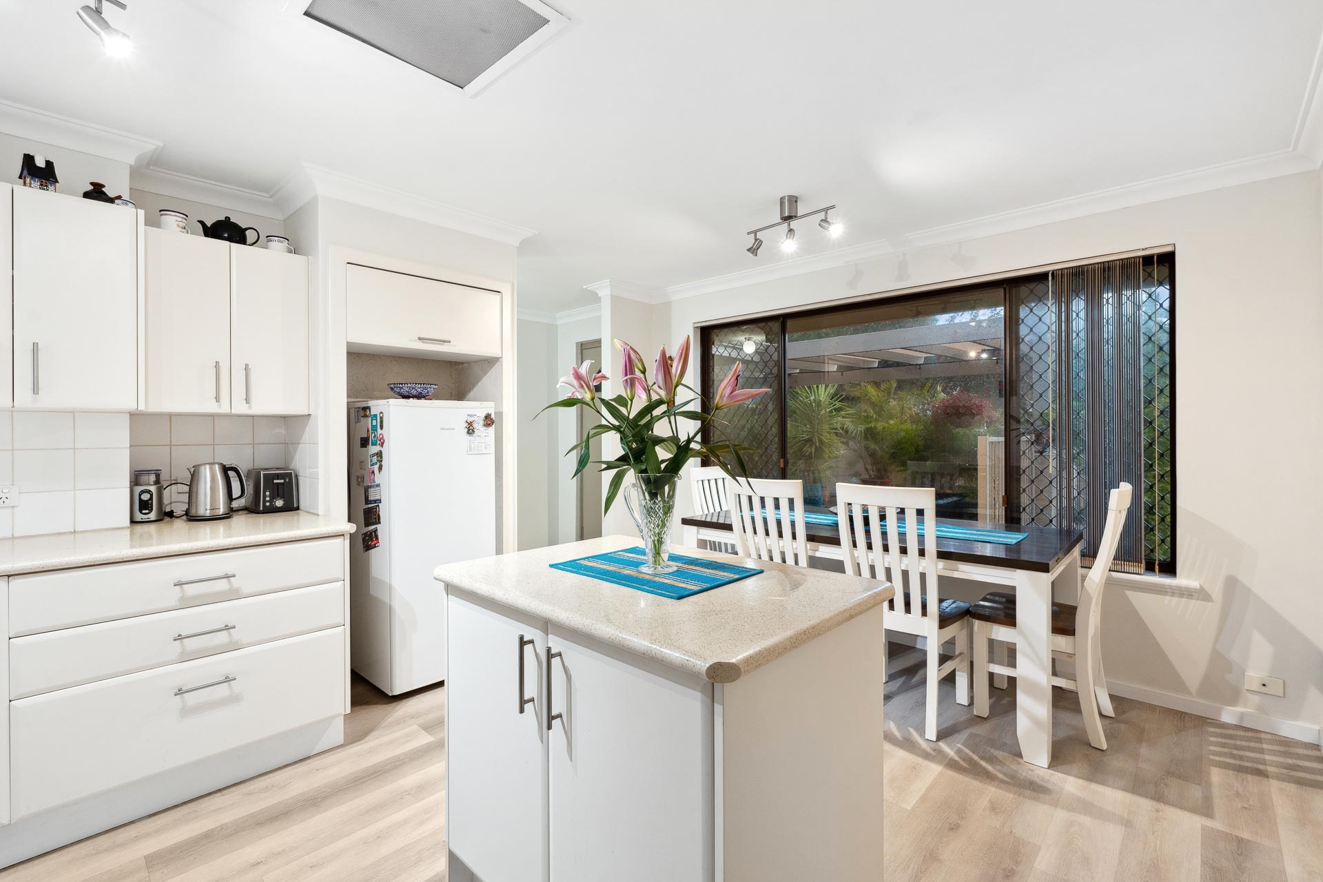Inside, a spacious carpeted lounge room welcomes you with a large bay window letting in plenty of natural light, plus an open plan meals and modern kitchen area at the hub. The updated kitchen boasts a central island bench for additional storage and preparation space, plus fridge recess, electric oven and stove, rangehood and plenty of cupboard space.