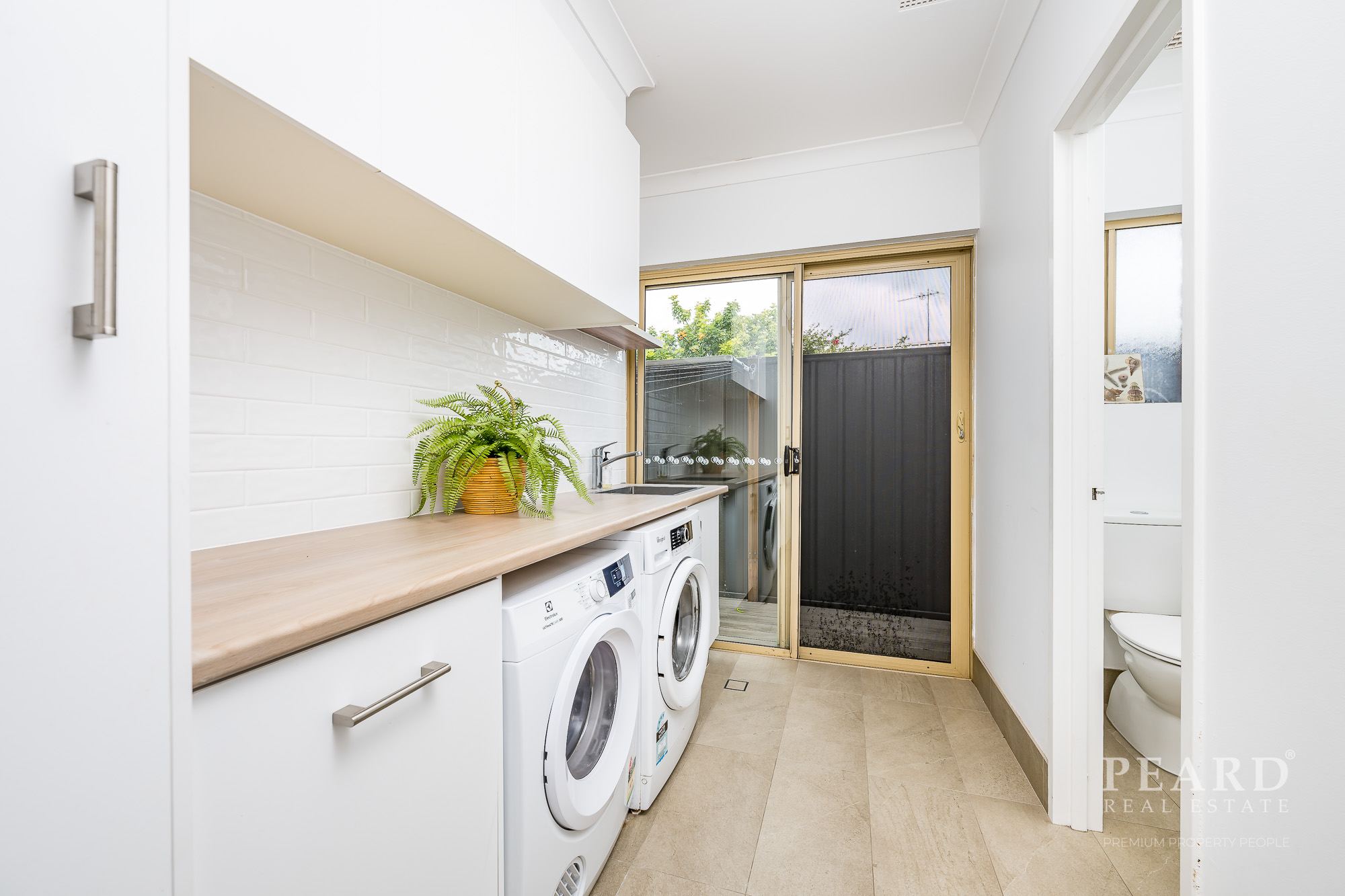 - Renovated laundry with timber-look benchtops, ample storage, tiled splashback and separate WC