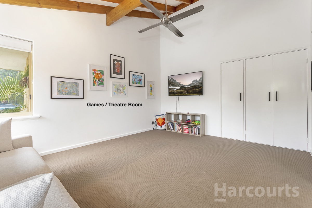 Additional highlights include a versatile sunken living area, perfect as a formal lounge, and a large rear games room with soaring ceilings and built-in storage.