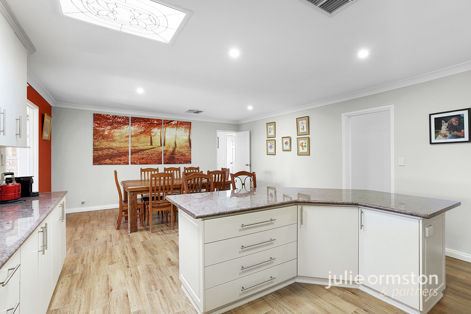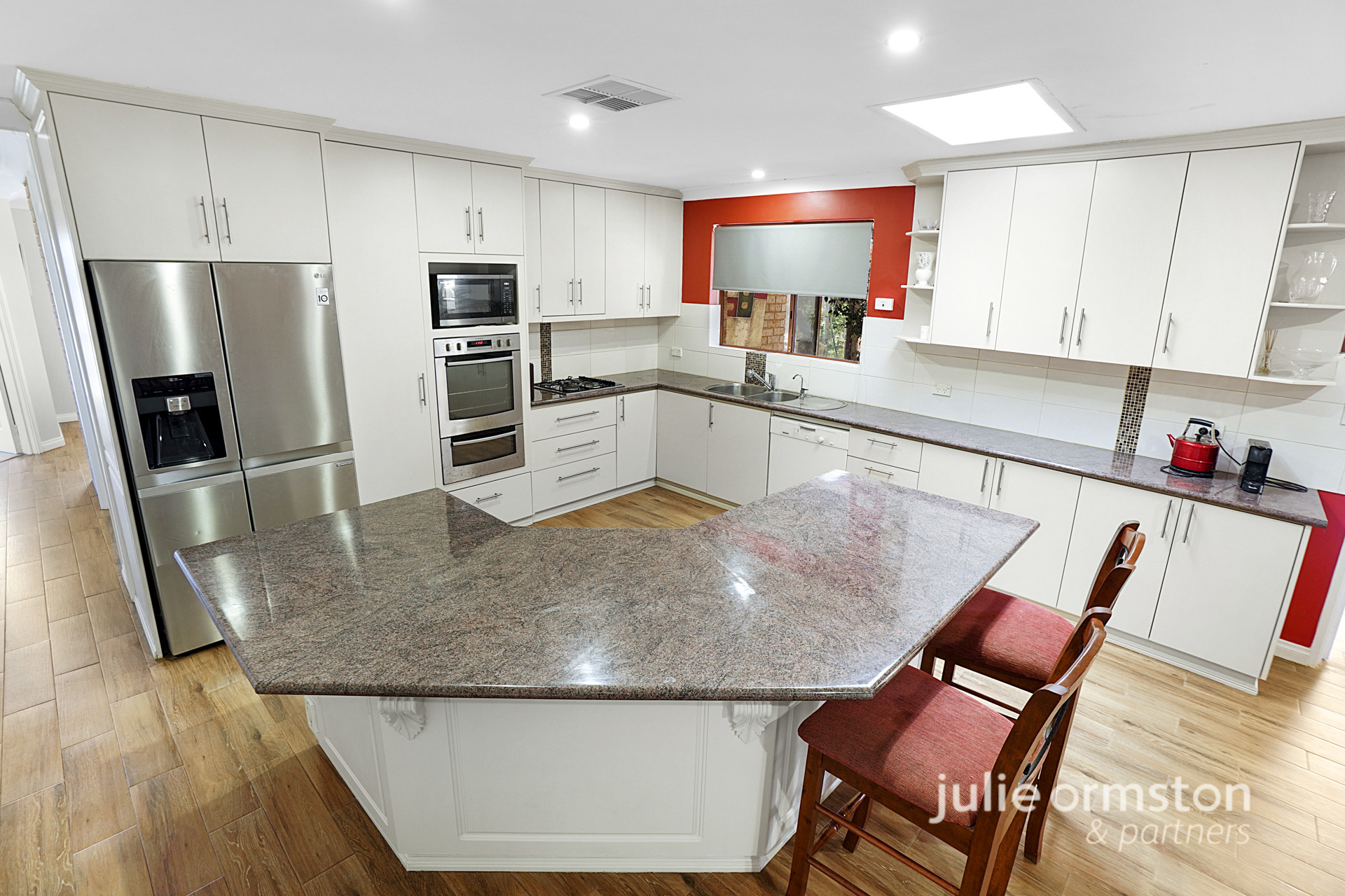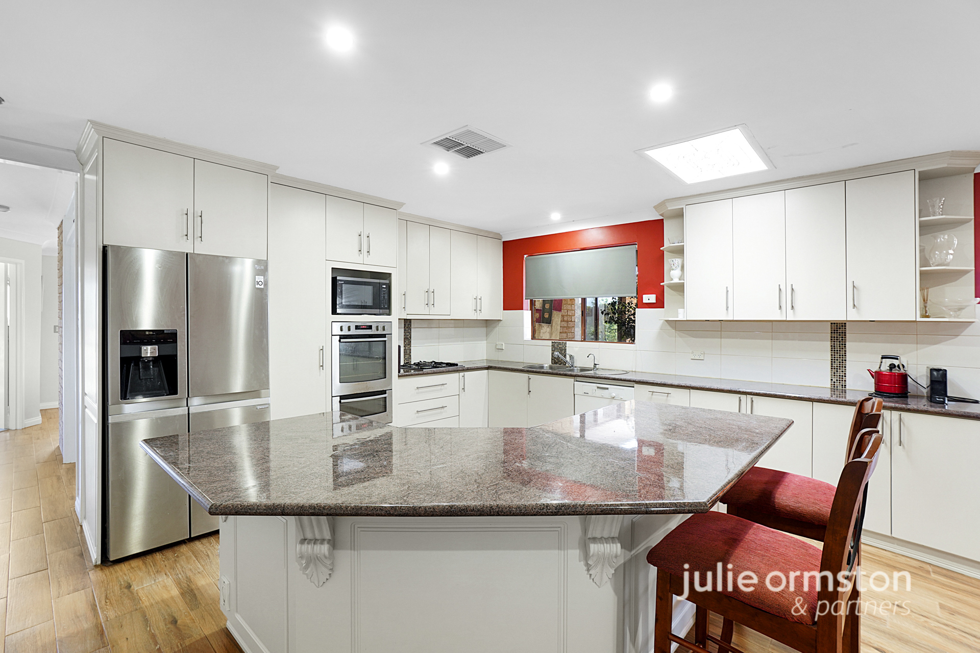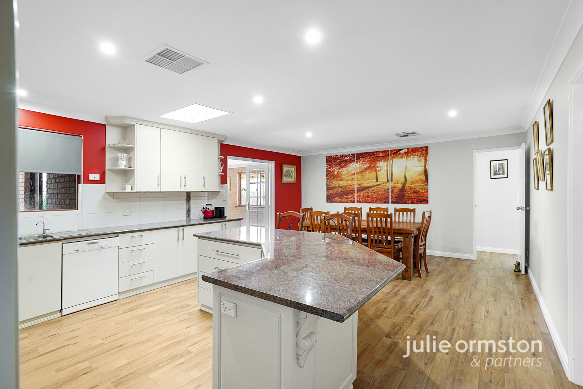 - Positioned right at the heart of the home, the updated kitchen provides an exceptional layout, allowing the whole family to come together and cook up a feast. Featuring extensive, granite look benchtops, the kitchen boasts a suite of quality appliances, including a Kleenmaid 4 burner gas cooktop, Westinghouse electric oven with separate grill, and a Miele dishwasher. Bright LED downlights plus a skylight, a double fridge recess, microwave recess, built in pantry, power points to the island bench, and double sink all make this kitchen extremely practical, and the generous under bench and overhead cabinetry will have all your storage needs well catered for.