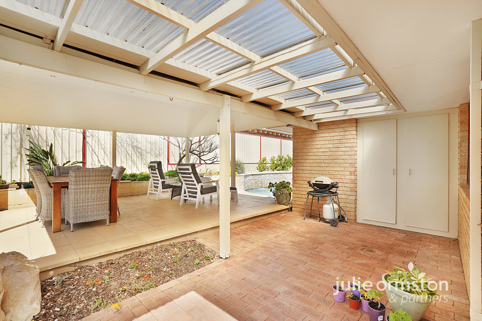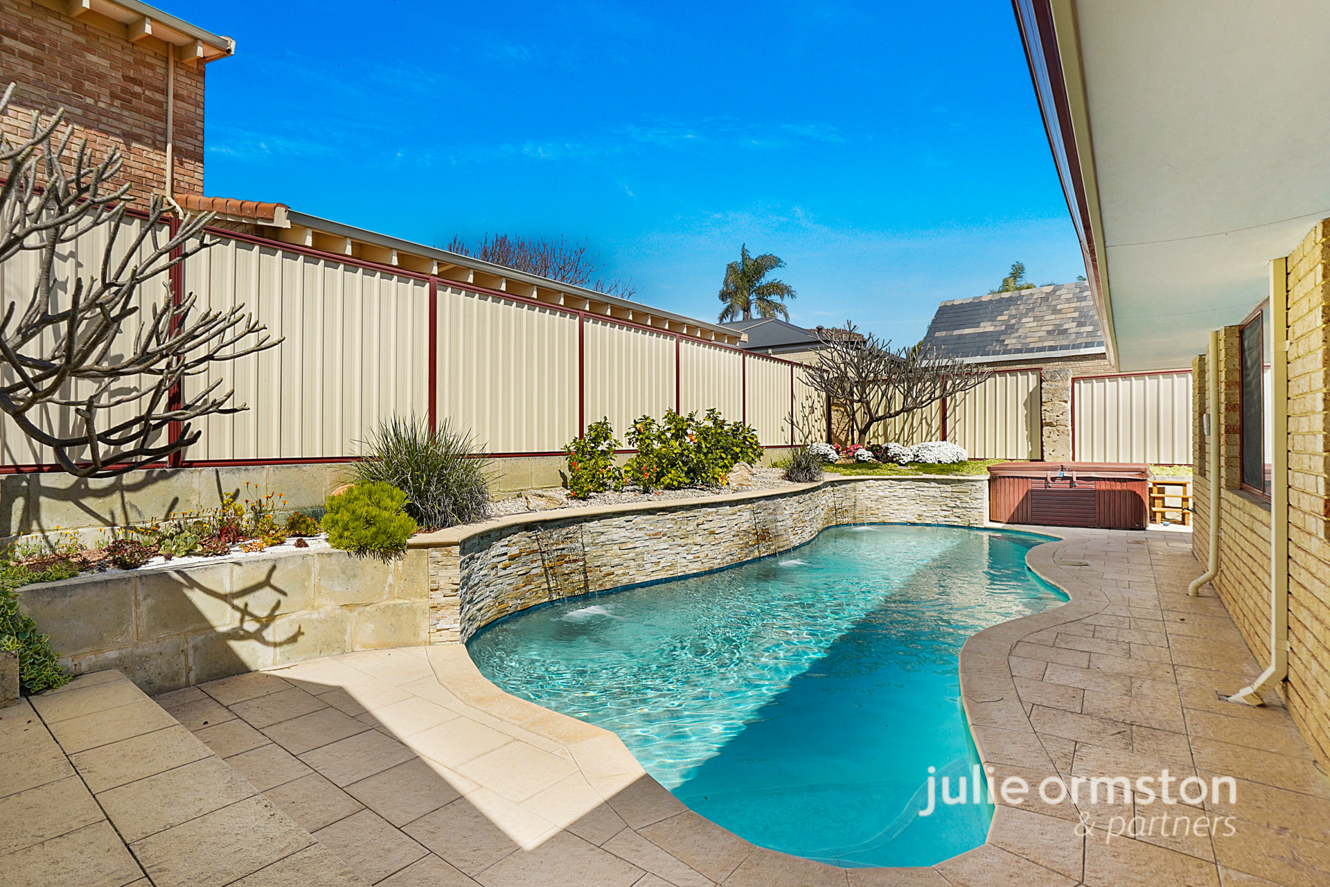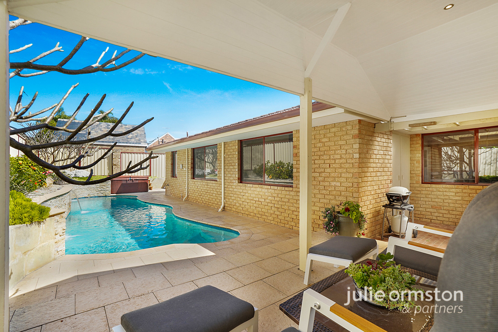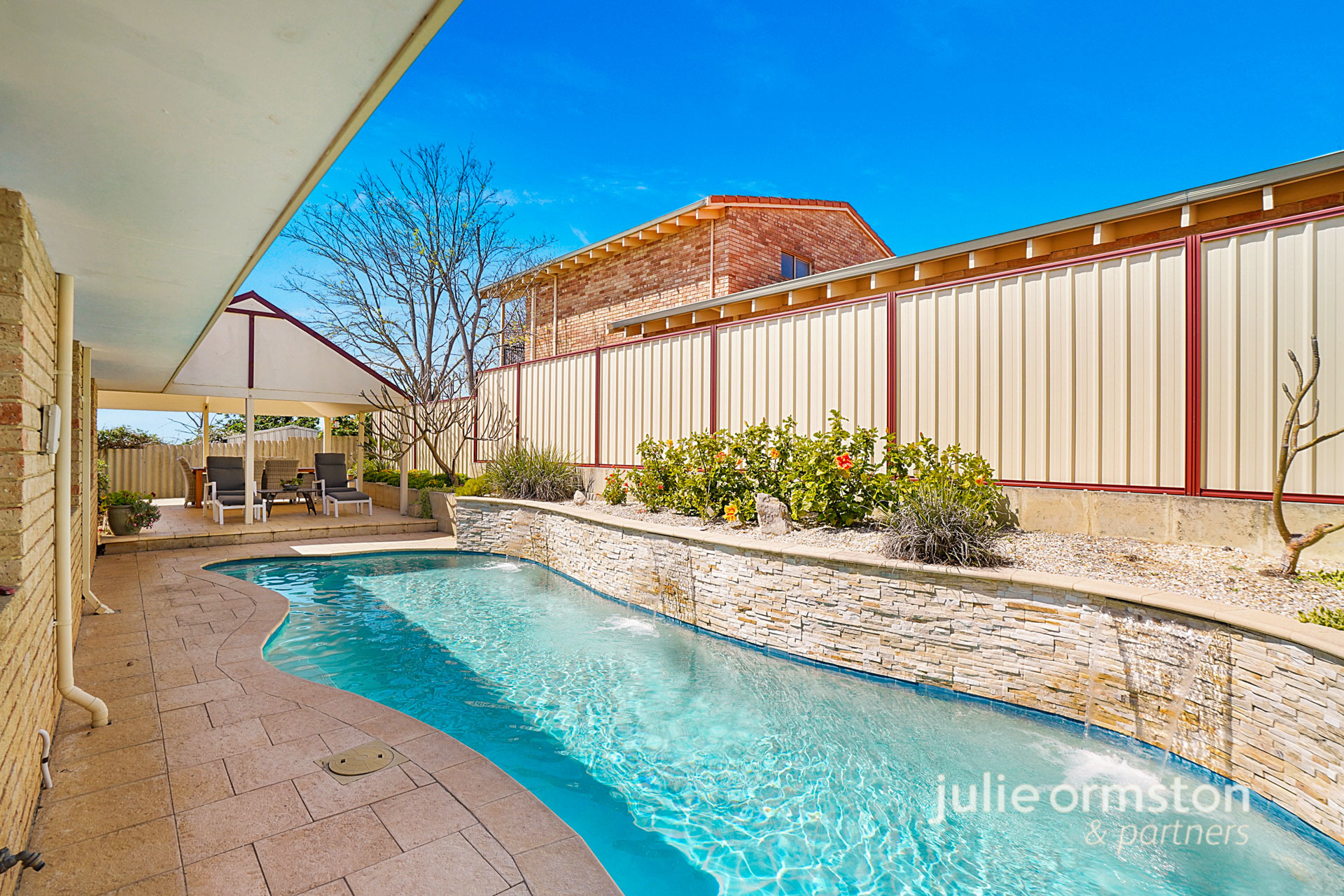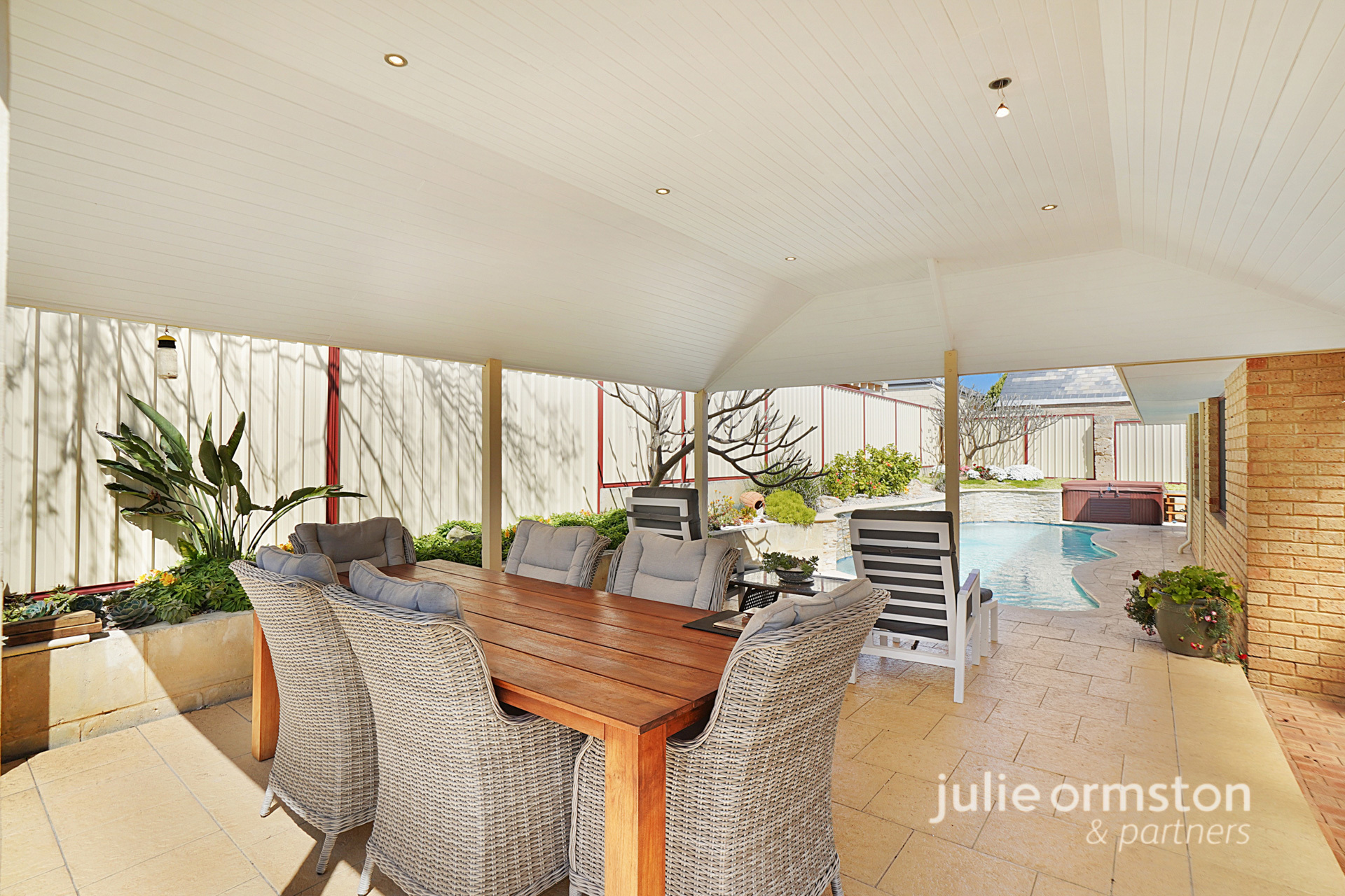 - For those who love to entertain, this backyard will impress! Wine, dine and relax under the comfort of your very own, timber cladded, gabled patio! Featuring LED lights and quality limestone paving and raised garden beds along the fence line, the patio overlooks the sparkling below ground, 60,000L salt water pool. The stunning pool also benefits from having 3 water blade features that run along the stone feature wall, and there's a separate spa also ready to enjoy! Completing the backyard, you'll find a sunken garden towards the front of the property, a brick storage area just before you reach the spacious patio area, and a lemon tree on the laundry side of the home.